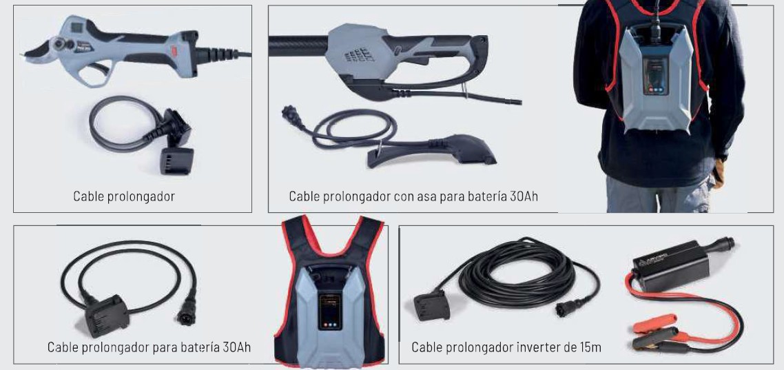 Gracias a los cables prolongadores se puede escoger entre el funcionamiento con batería incorporada, transportarla a parte o incrementar la potencia según las condiciones y tiempo de trabajo.